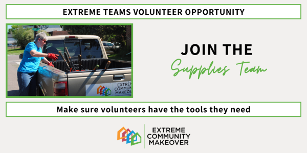 The Supplies Team confirms volunteers have the supplies needed to complete their projects, while monitoring the inventory of available supplies at the Command Center and toolshed. Team members can also develop relationships with businesses that can provide project supplies at discounted prices or at no cost.